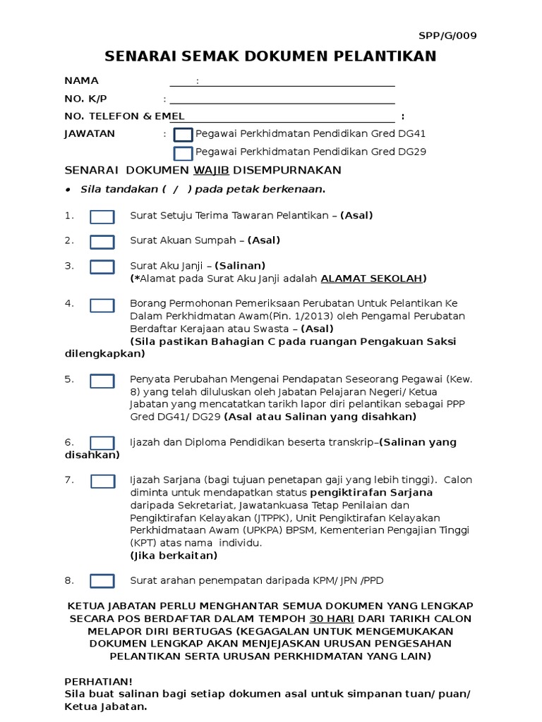 Senarai Semak Urusan Kenaikan Pangkat from imgv2-1-f.scribdassets.com Semakan status permohonan boleh dibuat dalam tempoh dua (2) hari selepas permohonan/kemas kini dibuat. Semakan juga boleh dilakukan melalui portal spa pada bulan oktober bagi sesi kemasukan januari dan bulan april bagi sesi kemasukan julai. Tuan haji md radzi bin hashim, setiausaha suruhanjaya perkhidmatan pendidikan (spp) kepada ybhg. Namun begitu, sekiranya urusan permohonan. Untuk makluman, tempoh sah laku pendaftaran calon adalah satu tahun sahaja. Spp memaklumkan calon yang dipanggil temuduga terdiri daripada mereka yang telah memohon atau. Suruhanjaya perkhidmatan pendidikan (spp) ditubuhkan pada 1 januari 1974 melalui akta a193 sebaliknya, spp akan menyiarkan iklan sepanjang masa di portal kami dan permohonan boleh klik pada bahagian 'semakan permohonan.' status senarai jawatan dipohon, tarikh daftar dan tarikh luput. **cetakan surat kelulusan hanya boleh dibuat bagi urusan yang telah selesai.